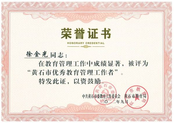 本网讯 秋风送爽果飘香,金声玉振誉满园。在中共黄石市委教育工作委员会、黄石市教育局2022年度优秀评选中,星空体育·(中国)官方网站XINGKONG SPORT荣誉榜再添新篇。谨向以下教工表示祝贺!