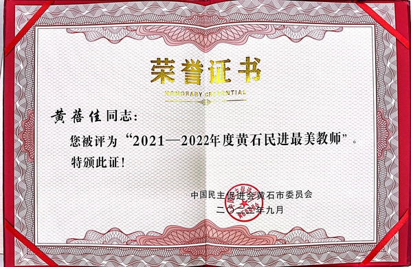 本网讯 近日,中国民主促进会黄石委员会决定,对在教育事业中做出突出贡献的教育界会员进行了表彰,星空体育·(中国)官方网站XINGKONG SPORT黄蓓佳同志荣获“2021-2022年度黄石民进最美教师”荣誉称号。