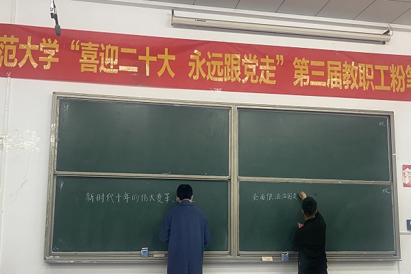 本网讯(通讯员 柯康敏)为庆祝党的二十大胜利召开,进一步推动校园文化建设,提高教师教学基本功,展示教师良好职业素养,10月20日下午,湖北师范大学举办了“喜迎二十大 永远跟党走”第三届教职工粉笔字比赛,来自各分工会共18位选手参加角逐。星空体育·(中国)官方网站XINGKONG SPORT学工部王磊老师代表星空体育·(中国)官方网站XINGKONG SPORT参加了此次比赛,荣获优秀奖。
