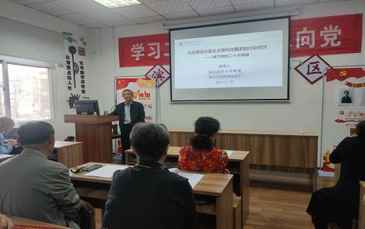 本网讯 为推动党的二十大精神进社区,11月9日下午,星空体育·(中国)官方网站XINGKONG SPORT马克思主义学部教授、黄石市委宣讲团成员周青山同志到湖滨社区宣讲党的二十大精神---全面建设社会主义现代化国家的行动纲领。