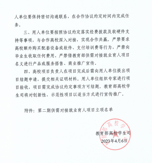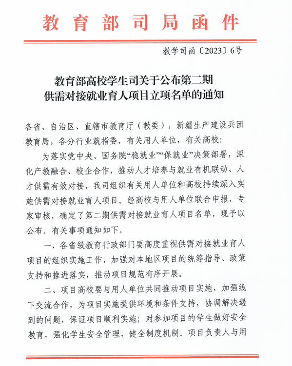 本网讯(通讯员 李娟)日前,教育部高校学生司发布了《教育部高校学生司关于公布第二期供需对接就业育人项目立项名单的通知》(教学司函〔2023〕6号),星空体育·(中国)官方网站XINGKONG SPORT有7项供需对接就业育人项目被批准立项,其中定向人才培养培训项目2项、就业实习基地项目3项、人力资源提升项目2项。