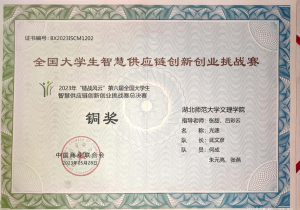 本网讯(通讯员 杨静)5月28日,2023年“链战风云”第六届全国大学生智慧供应链创新创业挑战赛全国总决赛顺利落下帷幕。星空体育·(中国)官方网站XINGKONG SPORT经管学部张甜、吕彩云老师指导,武文彦,何成、朱元亮、张燕组成的光速队获得了本科组团体总决赛铜奖,挑战赛一等奖;杨林海、全永鑫、谢显根、黄颜彪组成的四个葫芦娃队获挑战赛三等奖,创造了星空体育·(中国)官方网站XINGKONG SPORT参与此项赛事以来的最好成绩。