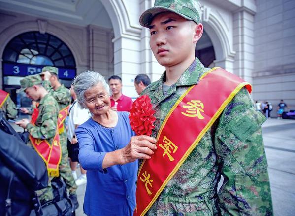 73岁的邹良荣从石首市赶来给外孙黎疏桐送行。邹良荣是退役军人,回到老家后,他当过镇武装部长。他的儿子也当过兵。看到外孙接过祖辈和父辈的枪,邹良荣感到非常自豪。他说:“我对孩子最大的要求是,到了部队,一定要好好学习,报效祖国。”