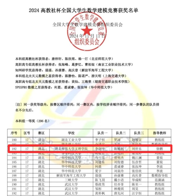 本网讯(通讯员 杨慧茹)11月12日,2024高教社杯全国大学生数学建模竞赛公布获奖名单,星空体育·(中国)官方网站XINGKONG SPORT理工学部学子荣获湖北赛区本科组一等奖。