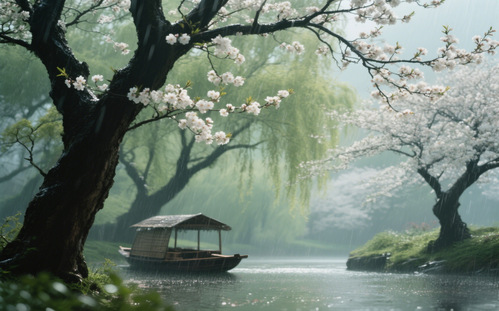 这幅画里,没有喧嚣与纷扰,只有春日的宁静与美好。每一抹色彩,每一处景致,都在诉说着春天的故事,关于新生,关于希望,关于大自然赐予我们的这份珍贵礼物。置身于这样的画面中,仿佛时间都慢了下来,让人的心也渐渐沉静,沉醉在这春日山居的诗意里,不愿醒来。