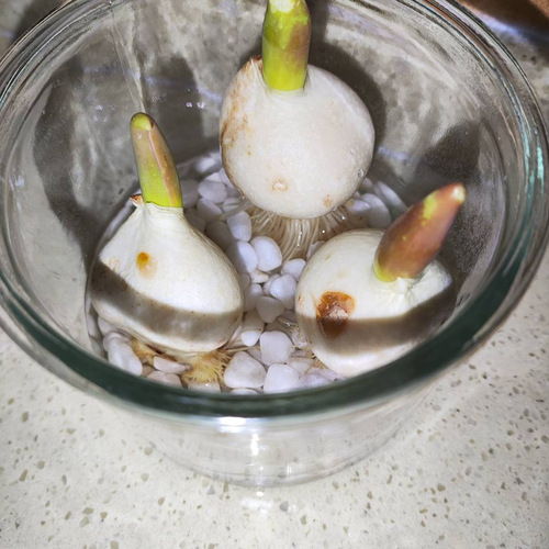 最初五天像等待解冻的冰层,球根始终保持着瓷白的沉默。每天晨起下床,总看见它安静地悬浮在玻璃与水的结界里,连水线蒸发的痕迹都清晰可辨。直到某个飘着冷雨的傍晚,忽然发现球茎底部渗出几缕乳白丝线——那是根系初生的絮语,在暮色里泛着珍珠母贝的光泽,如同少女初次垂落的长发。