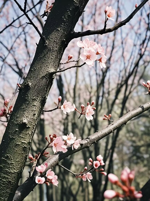 春寒料峭,粉红色的花苞已然点缀在枝头,看那初绽的花苞,好似一个个羞涩的梦,在初春的风中微微颤动,每一个苞芽都诠释了对生命的渴望。灰蒙的天空,是未展的画卷底色,衬托着娇嫩的生命迹象。它们似在积蓄力量,等待着生命中最美的那一刻,又似在与初春的寒风暗暗较劲,在生长路上踽踽独行。这些花苞如生命中刚刚萌芽的希望,虽不起眼,却蕴含着无限可能。