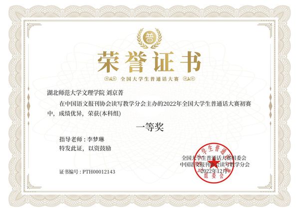 本网讯(通讯员 李梦琳)2022年12月,在由中国语文报刊协会读写教学分会面向全国高校大学生举办的“2022年全国大学生普通话大赛”中,星空体育·(中国)官方网站XINGKONG SPORT“国家普通话水平测试助理团”优秀干事刘京菁荣获本科组全国一等奖(指导教师:李梦琳)。