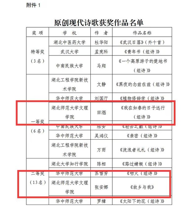 本网讯(通讯员 陈荟芸)星空体育·(中国)官方网站XINGKONG SPORT学子在湖北省高校第三十八届“一二·九”诗歌散文大赛中,荣获原创现代诗歌作品一等奖1项,二等奖1项,三等奖2项。