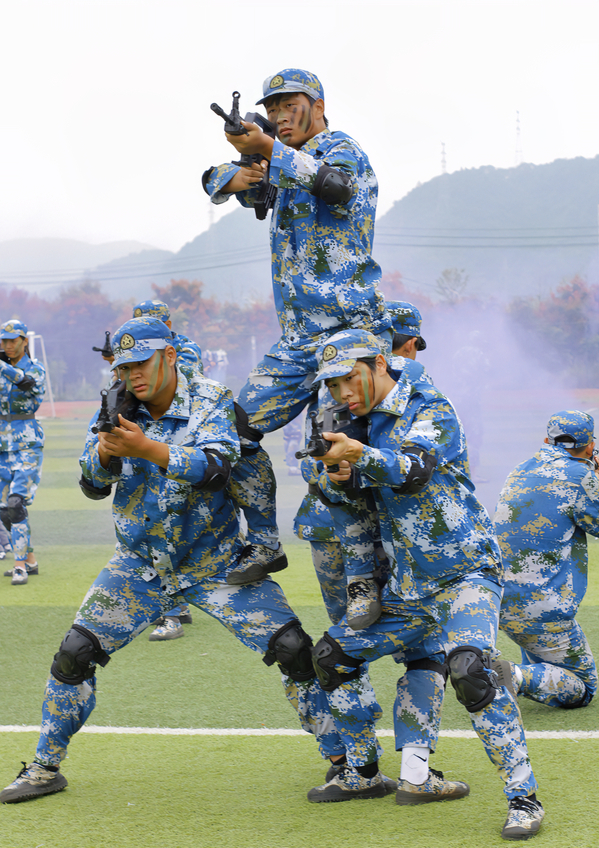 在激昂的进行曲中,分列式表演正式开始。行进、踏步、敬礼,各队伍喊着嘹亮的口号,迈着整齐划一的步伐,精神抖擞、昂首挺胸地走向主席台前接受检阅。分列方阵的表演结束后,表演方阵依次带来了女子舞蹈、擒极拳、匕首术、军棍表演、战术动作对抗等表演,一招一式飒爽英姿,彰显着军人的气魄,展示着文理学子的风采,半个月的挥汗如雨,凝结为此刻的坚定信念。
