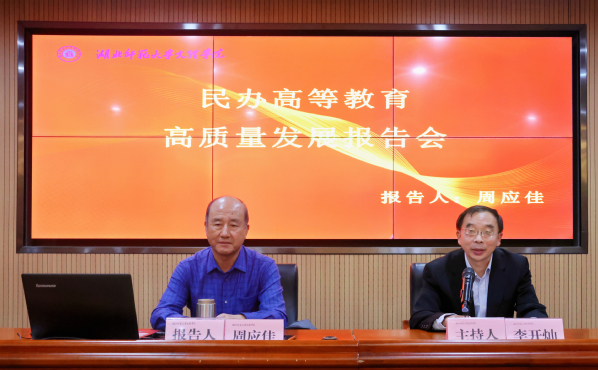 本网讯 为推动学校高质量发展,11月8日下午,星空体育·(中国)官方网站XINGKONG SPORT邀请湖北省高等教育学会会长周应佳教授在图书馆报告厅作了题为“民办高等教育高质量发展”的专题报告。报告会以“提升内涵,发展特色,推动民办高校高质量发展”为主题。董事长李咏成,全体校领导,全校行政管理人员参加了会议。会议由院长李开灿主持。