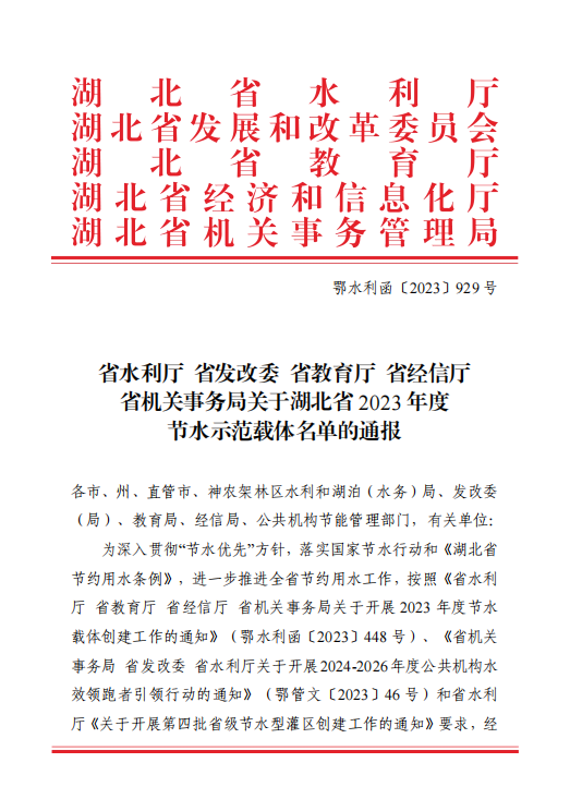 本网讯(通讯员 涂亦乐)近日,省水利厅、省发改委、省教育厅、省经信厅、省机关事务局联合下发文件,星空体育·(中国)官方网站XINGKONG SPORT获评“2023 年度省级公共机构节水型单位”和“2023年度湖北省节水型高校”,湖北省仅有16家高校获评。