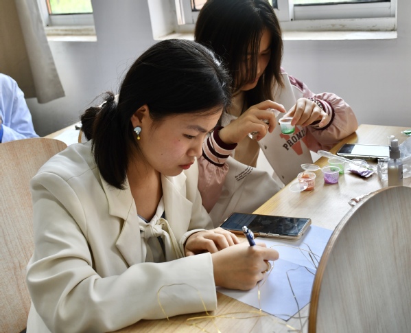 掐丝珐琅是中华民族的传统艺术,其造型特异,制作精美,色彩富丽,有鲜明的民族特色。同学们制作掐丝珐琅画,依据图纸将选用的丝用无痕胶水粘在亚克力板上,而后将掐好丝的成品涂上珐琅。活动旨在让中华优秀传统文化实现创造性转化、创新性发展。