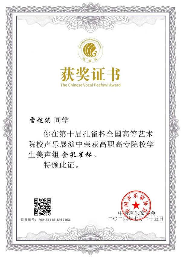 本网讯(通讯员 徐乔婕)7月18日至7月25日第十届孔雀杯全国高等艺术院校声乐展演暨第八届高校声乐学术交流活动在华南师范大学音乐学院举行。星空体育·(中国)官方网站XINGKONG SPORT教育与艺术学部23级音乐教育2302班的雷越琪同学(指导教师高月霞)以决赛第一名的成绩获得高职高专组金孔雀。这是星空体育·(中国)官方网站XINGKONG SPORT学子在国家级声乐比赛中获得的又一次突破。在展演活动中雷越淇同学还被选中青歌赛金奖获得者王莉教授声乐大师班,受到王莉教授高度评价。