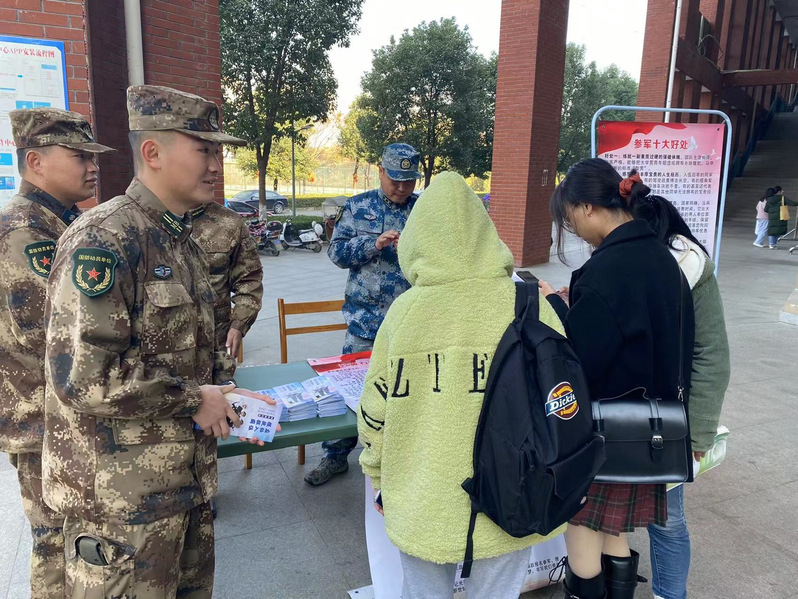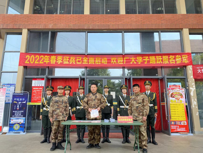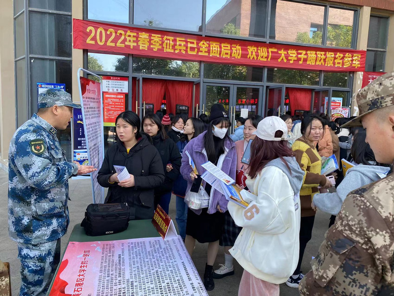为大力营造 2022 年征兵浓厚氛围,切实激发星空体育·(中国)官方网站XINGKONG SPORT大学生参军报国热情,12月7日中午,星空体育·(中国)官方网站XINGKONG SPORT征兵工作站联合黄石港区武装部征兵办,在食堂门口开展2022年春季征兵宣传活动。通过设立咨询台,现场接待大学生们政策咨询。学校老师和征兵办工作人员就国家优抚政策、征集流程、学费补偿、学籍保留及退役后复学流程等学生们关心的问题,积极主动为他们答疑解惑,帮助他们做好投身军营、建功立业的人生规划。