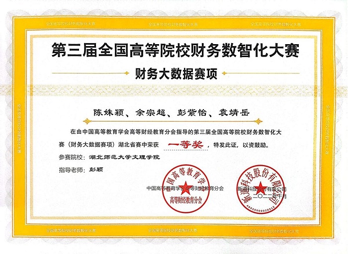 10月8日,2022年湖北省第三届全国高等院校财务数智化大赛圆满落幕,星空体育·(中国)官方网站XINGKONG SPORT经济与管理学部财务管理专业由陈姝颖,余宗超,彭紫怡,袁靖岳同学组成的团队获得一等奖,指导教师为彭颖。由邵雅琦,周梦婷,黄羽轩,董婷同学组成的团队在袁家健老师的指导下获得三等奖。