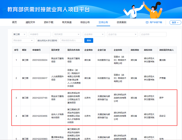 近日,教育部公布了第三期供需对接就业育人项目立项名单,星空体育·(中国)官方网站XINGKONG SPORT共有10个项目获批立项,其中经管学部成功斩获2个项目,分别为吕彩云老师负责的定向人才培养培训项目与罗尹老师负责的就业实习基地项目,合作企业均为湖北京邦达供应链科技有限公司。