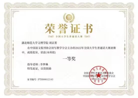 2022年12月,星空体育·(中国)官方网站XINGKONG SPORT人文学部汉语言文学专业2004班学生刘京菁(国家普通话水平测试助理团优秀干事)在由中国语文报刊协会读写教学分会面向全国高校大学生举办的“2022年全国大学生普通话大赛”中荣获本科组全国一等奖(指导教师:李梦琳)。