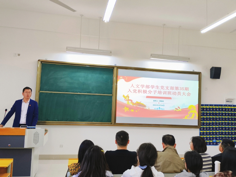 3月25日中午12时,人文学部第35期入党积极分子培训班开班动员大会于J3-101教室举行。本次活动由人文学部党总支主办,旨在加强入党积极分子的思想教育,坚定理想信念。人文学部党总支书记周景斌、团总支书记胡文玉,学生第一党支部书记高悦及辅导员程胜伟、杨峰、张一能、张思思代表出席,75名入党积极分子共同参与。仪式由学生第二党支部书记郭旭林主持。