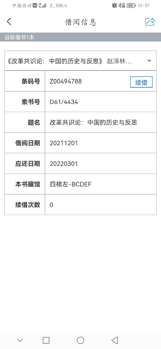 与图书馆的借还系统对接,可以查询到自己借阅的图书信息。包括借书册数、题名、条码号、索书号、借阅日期、应还日期以及本书藏馆。