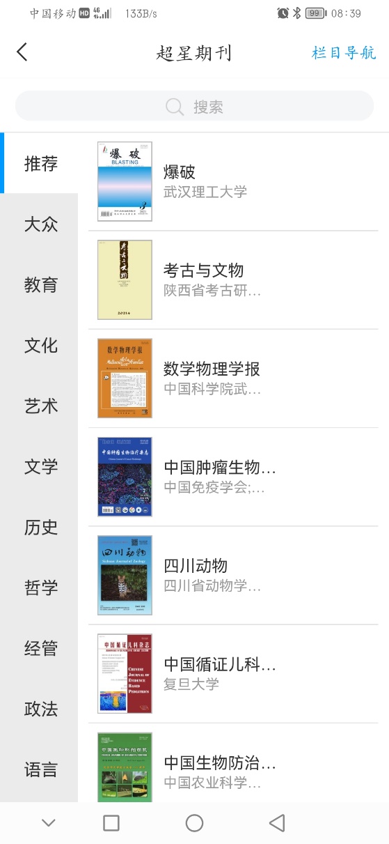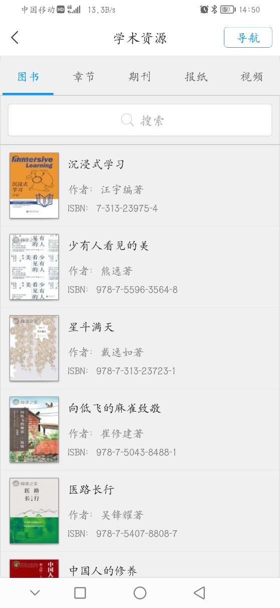 包括图书、章节、期刊、报纸、视频、论文,其中期刊、论文是对接中国知网,可以对知网里的文献进行检索和下载。在每个栏目右上角有导航按钮,可以快速查找不同类别的文献,也可以在搜索框输入要检索的文献关键词,即可实现文献检索。