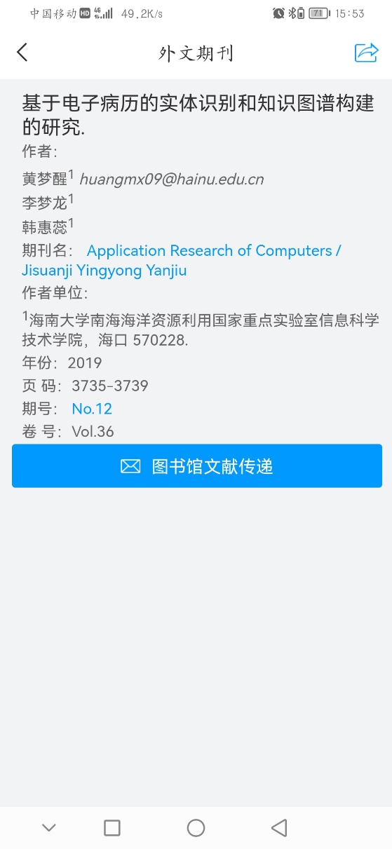 在期刊一栏,通过搜索标题、作者、刊名或者关键词可以实现检索。对需要的期刊可以在线阅读,也可以文献传递到邮箱。