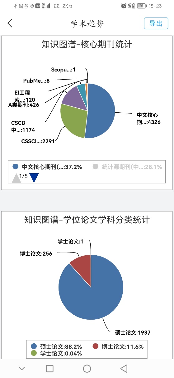 “学术趋势”是对该关键词各类型学术发展趋势曲线图,以及各项统计。