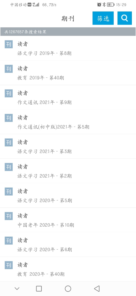 通过关键词检索出文献后,如果需要更详细的划分,可以点击右上角的筛选,通过输入关键词实现二次检索。找到想要的文献后,可以点击“阅读全文”实现在线阅读,也可以点击“下载”到本地书架离线观看,或者点击“文献传递”将文献发送到邮箱,需要注意每次传递范围不能超过50页。