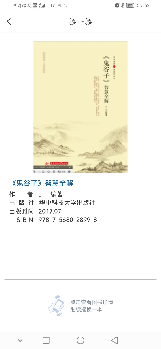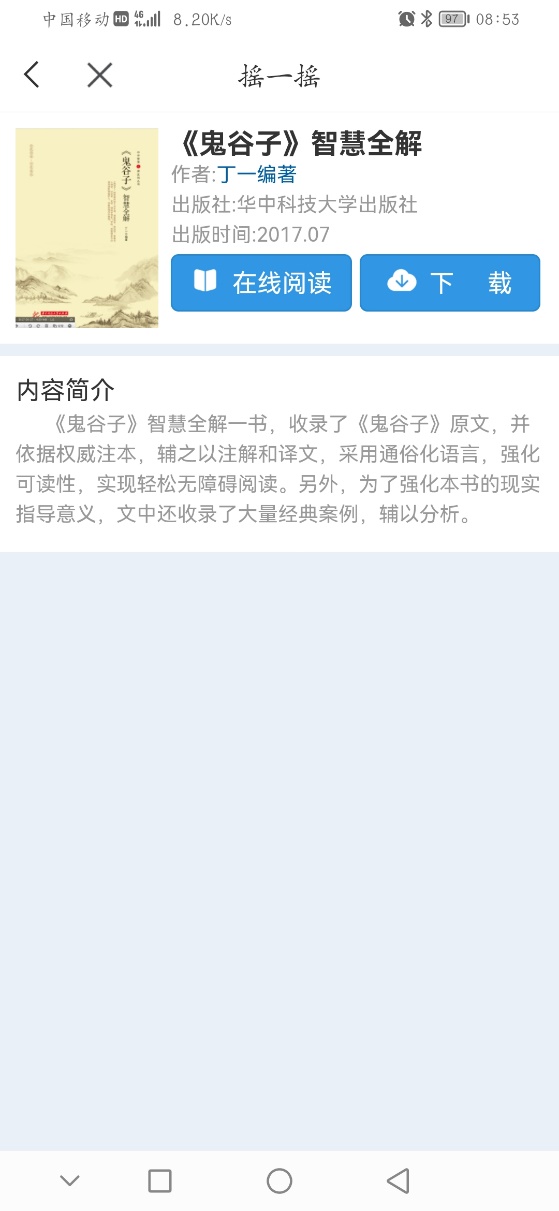 “摇一摇”是为读者智能推荐相关书籍,点击可以查看图书详情,继续摇换一本图书。每一本图书都支持在线阅读和下载到书架离线观看。