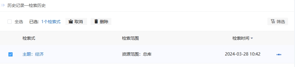 批量管理检索历史,可先单击全选或勾选检索式前复选框,再点击“取消”或“删除”按钮,对已选检索式进行批量取消勾选或批量删除的操作。