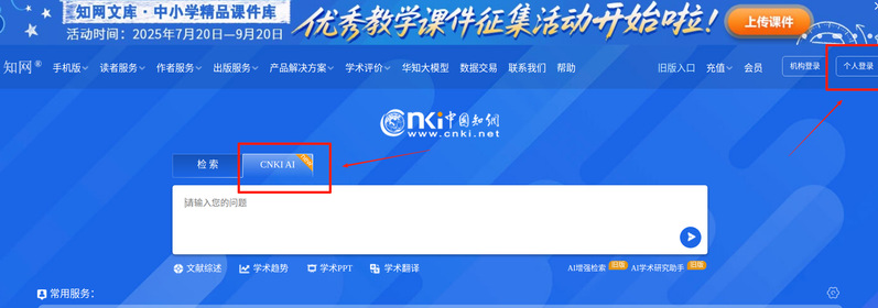 访问方式:登录知网首页www.cnki.net,后切换至CNKI AI进入。右上角机构登录显示“星空体育·(中国)官方网站XINGKONG SPORT”后,点击右上角“个人登录”,注册/登录个人账号后登录使用。