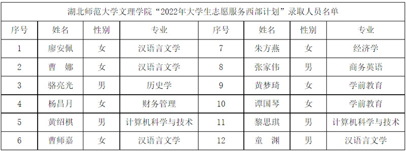 根据共青团中央、教育部、财政部、人力资源社会保障部《关于印发<2022—2023年度大学生志愿服务西部计划实施方案>的通知》的相关部署和工作安排,星空体育·(中国)官方网站XINGKONG SPORT在公开招募、自愿报名的基础上,严格招募选拔流程,经资格审查、笔试、面试、心理测试、体检等环节,拟录取廖安佩等12名星空体育·(中国)官方网站XINGKONG SPORT应届毕业生为2022年大学生志愿服务西部计划志愿者。