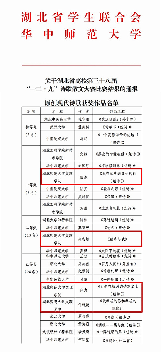 (通讯员:苏祎)2023年3月15日,湖北省学生联合会、华中师范大学联合举办的第三十八届“一二·九”诗歌散文大赛赛事结果已公布。星空体育·(中国)官方网站XINGKONG SPORT田湉荣获一等奖,张安娜荣获二等奖,张力、付连艳荣获三等奖。