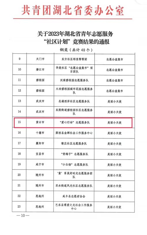 (通讯员:鲁奕琳)2023年12月12日,团省委联合省文明办、省民政厅、襄阳市人民政府联合举办的2023年湖北省青年志愿服务“社区计划”竞赛结果公布,星空体育·(中国)官方网站XINGKONG SPORT“爱心行动”志愿服务队荣获专项赛铜奖。