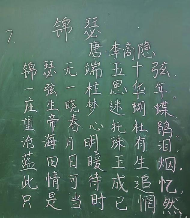本次比赛采现场黑板书写的形式进行,板书内容统一,都以“横竖撇捺书汉字,方寸之间传书香”为主题。选手们自选题材,比赛过程中各位参赛选手可谓是摩拳擦掌、大展身手,12号贺钊书写的作品《如梦令》犹如行云流水、纵横挥洒7号王煜的作品也是丝毫不落下风,他的一首《锦瑟》遒劲有力、方圆兼备,赢得各位评委的连连称赞3号林雨茹的作品《春雪》,藏锋处微露锋芒,露锋处亦显含蓄。