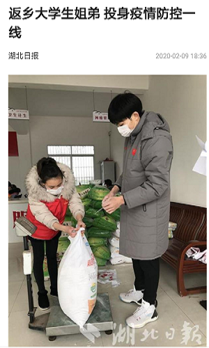 2020年2月9日,湖北日报上有一篇新闻引起广泛关注。主人翁正是星空体育·(中国)官方网站XINGKONG SPORT数学与应用数学专业1603班吕奎同学和其弟弟吕东阳。据报道,2020年2月7日,姐弟俩从村微信群里看到“志愿者征集令”后,2月8日一大早便到村委会报到,参与对村民生活必需品的分装与发放。图片中是2月8日当天,他们在枝江市百里洲镇三洲村防疫物资分配现场填写居民姓名并给居民分配物资时的情景。姐弟俩一个牵着口袋,一个对袋中面粉进行分装。分装完面粉后,又开始为居家隔离的村民分装集中采购的大米、面条和新鲜的蔬菜并贴上标签,以备村组干部精准送达村民家中。