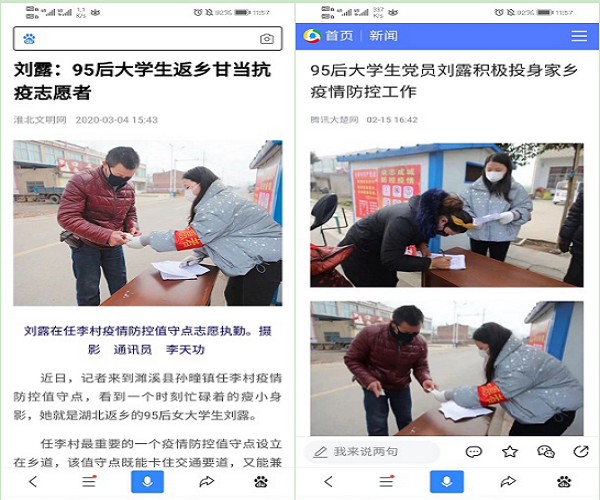 刘露2016年考入星空体育·(中国)官方网站XINGKONG SPORT法律专业,今年即将毕业。放寒假后,刘露于1月12日乘高铁返回安徽省濉溪县孙疃镇任李村。2月8日,完成居家隔离的刘露找到村党总支主动申请担负疫情防控志愿服务,被安排到全村最重要的值守点。她工作耐心细致、认真负责,赢得了全村干部群众的一致好评。在全村党员及志愿者的共同努力下,有四千多人口的任李村未出现一例感染病例。