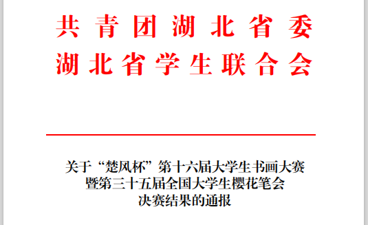 12月23日,团省委、省学联公布了“楚风杯”第十六届大学生书画大赛暨第三十五届大学生樱花笔会决赛结果,星空体育·(中国)官方网站XINGKONG SPORT夏诚、徐子惠、李黎三位同学分别荣获硬笔组二等奖、软笔组三等奖、绘画组优秀奖。