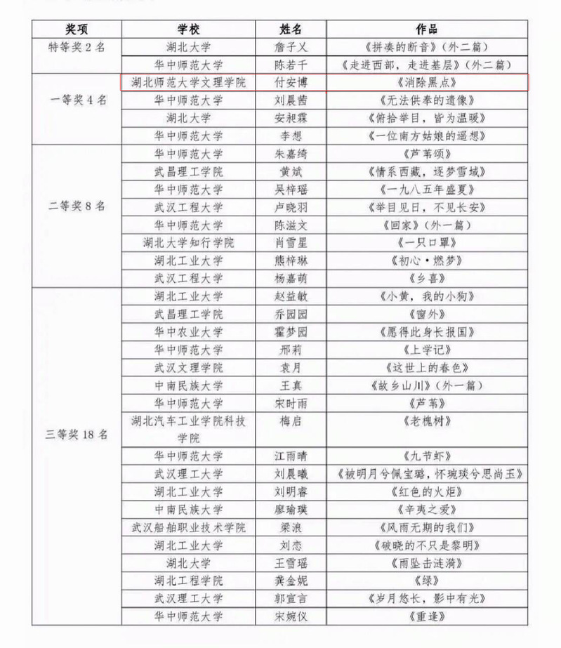 (通讯员刘萍萍) 近日,湖北省高校第三十六届“一二·九”诗歌散文大赛获奖名单揭晓,经评委会层层筛选,星空体育·(中国)官方网站XINGKONG SPORT汉语言文学1904班付安博同学的作品《消除黑点》荣获大赛一等奖。