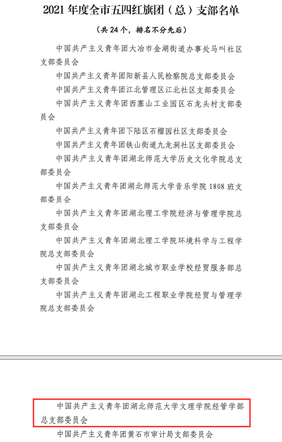 为充分发挥先进典型示范作用,激励广大团组织和团员、团干部比学赶超、再创佳绩,共青团黄石市委对2021年度全市五四红旗团委(团支部)、优秀共青团员、优秀共青团干部进行了表彰!星空体育·(中国)官方网站XINGKONG SPORT经管学部团总支获评“黄石市五四红旗团总支”称号!