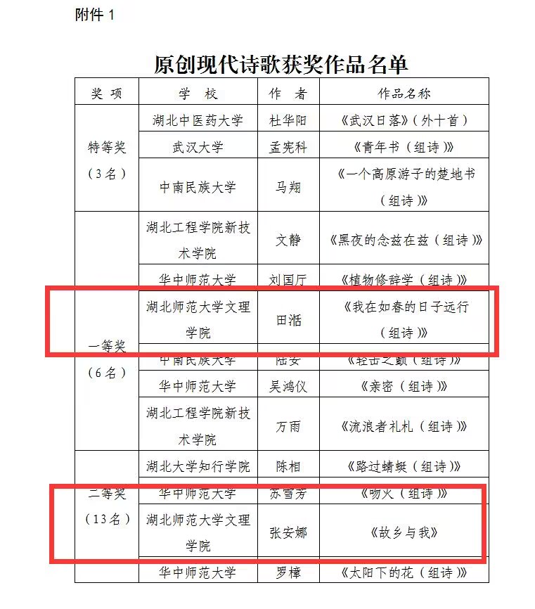 湖北省高校第三十八届“一二·九”诗歌散文大赛以“青春著华章·献礼二十大”为主题,面向湖北省内各高校在校学生开展原创现代诗歌和散文作品评比,全省各高校高度重视、积极响应,青年学生参与广泛,总计收到来自省内56所高校的2030份作品。经评审委员会专家评审,从众多原创现代诗歌作品中分别评选出3名特等奖、6名一等奖、13名二等奖、28名三等奖。