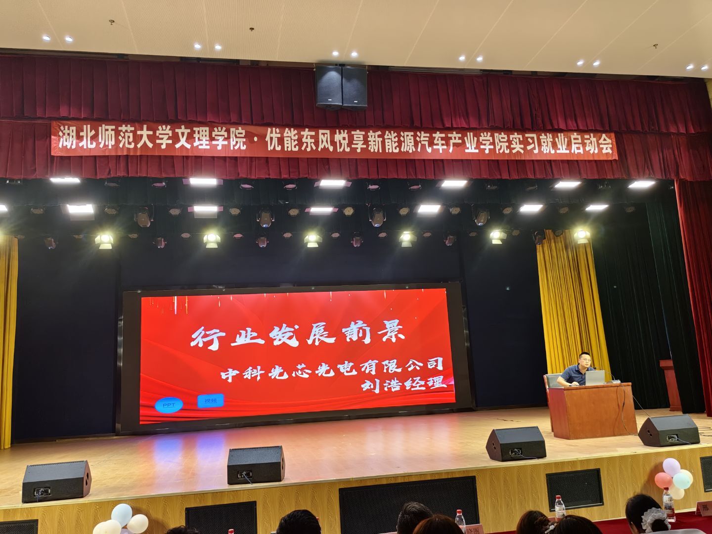 本次会议汇聚了校内外多方力量,特邀嘉宾包括:湖北师范大学产教融合学院学生党支部书记费凡老师、优能东风悦享新能源汽车产业学院教学主任邢凯老师与卫嵩荞老师、零跑汽车企业负责人张晓丽经理、湖北冬颉科技有限公司王鹏经理、中科光芯光电有限公司刘浩经理、武汉优能高教就业经理何应慧老师。此外,全体辅导员、专任教师及2023级学生共同参会,现场气氛热烈,展现了师生对实习工作的高度重视。