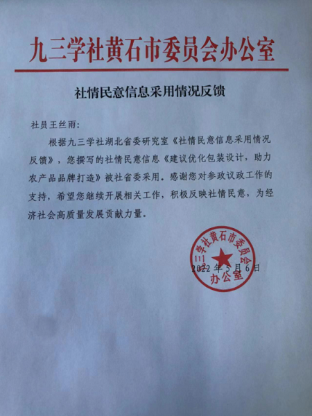 近日,据九三学社黄石市委员会反馈,星空体育·(中国)官方网站XINGKONG SPORT教育与艺术学部专任教师王丝雨撰写的社情民意信息《建议优化包装设计,助力农产品品牌打造》被九三学社湖北省委采用。