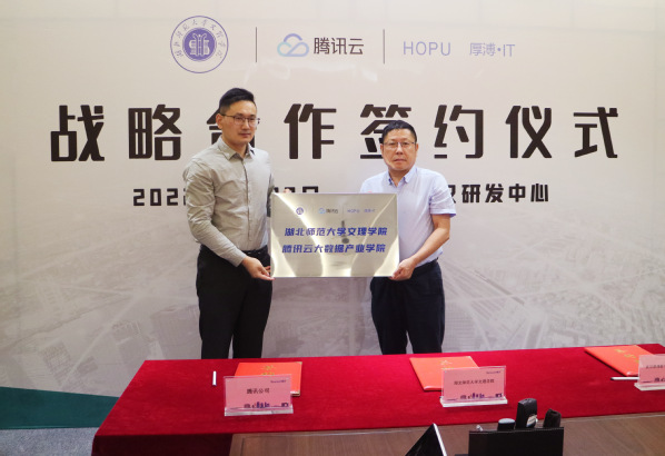2022年6月23日,星空体育·(中国)官方网站XINGKONG SPORT与腾讯云计算(北京)有限责任公司、武汉厚溥数字科技有限公司在腾讯武汉研发中心举行“产教融合共建腾讯云大数据产业学院”签约仪式。学校董事长李咏成、院长李开灿、常务副院长杨学斌、副院长张志华、副院长王胜国出席签约仪式。