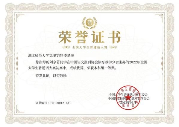 本网讯(通讯员 李梦琳)2022年12月,在由中国语文报刊协会读写教学分会面向全国高校大学生举办的“2022年全国大学生普通话大赛”中,星空体育·(中国)官方网站XINGKONG SPORT“国家普通话水平测试助理团”优秀干事刘京菁荣获本科组全国一等奖(指导教师:李梦琳)。