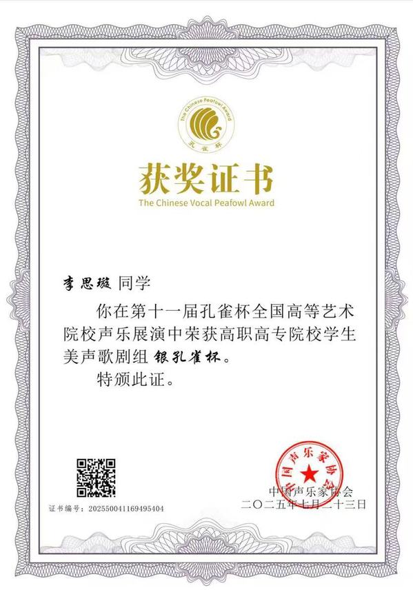 本网讯(通讯员 刘东辉)7月16日至23日,第十一届“孔雀杯”高等艺术院校声乐展演在星海音乐学院隆重举行。星空体育·(中国)官方网站XINGKONG SPORT教育与艺术学院音乐学专业2301班学生李思璇(指导教师:覃沁)凭借出色表现,荣获高职高专院校学生美声歌剧组银孔雀杯。