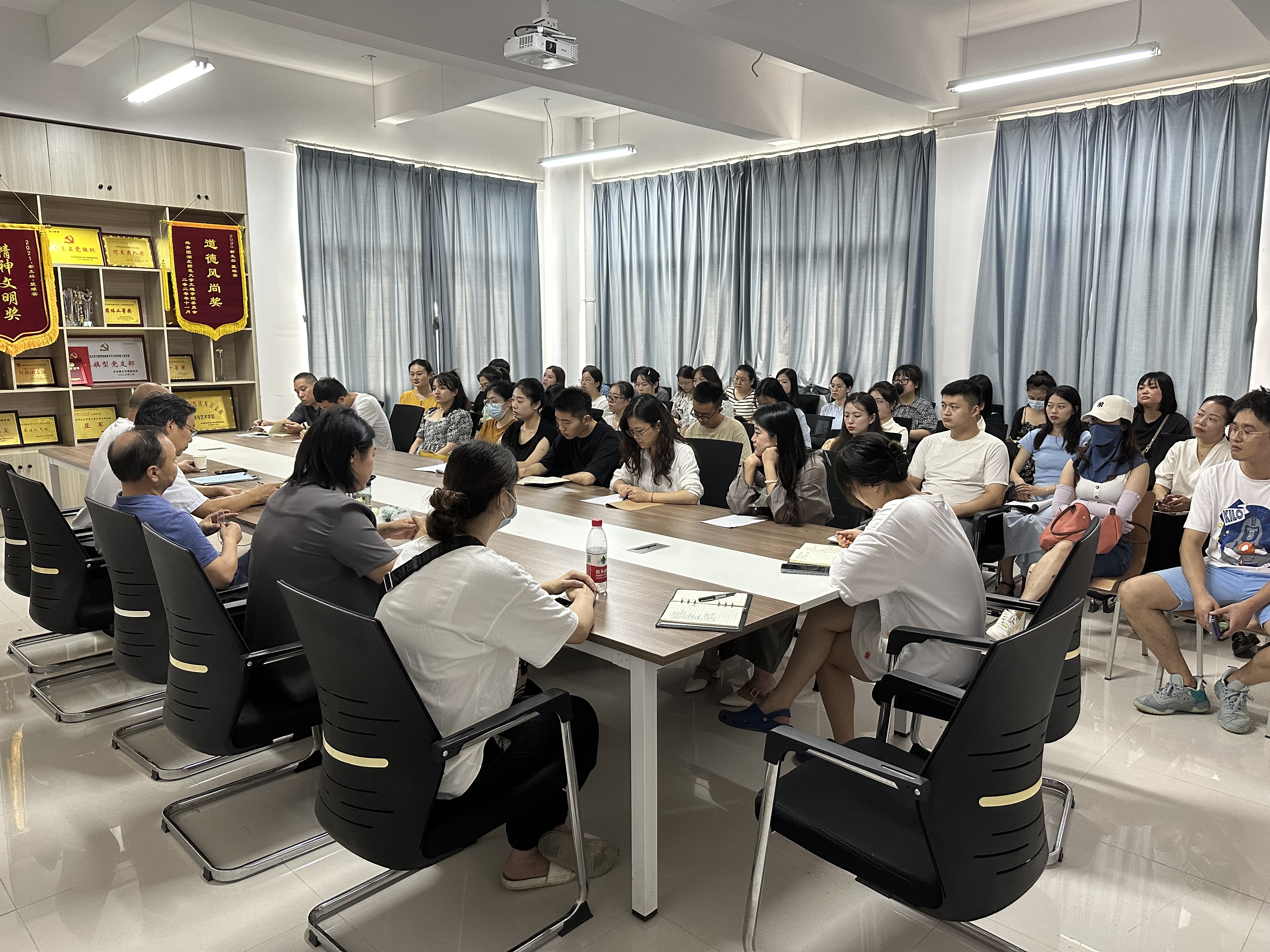 2023年8月26日上午9:00,教育与艺术学部在1号实验楼414会议室召开了全体教职工新学期工作会议,参加此次会议的有学院党委副书记杨之毛、学部主任王文、学部党总支书记李先华及教育与艺术学部全体教职工,本次会议主要包括以下几个议程:1.新进教职工进行自我介绍;2.李先华书记传达学校23日召开的干部会议精神与要求;3.王文主任对学部上半年的重点工作进行回顾并安排部署下半年的重点工作;4.杨之毛书记就坚持内涵发展、紧扣立德树人、突出质量建设、聚焦规范管理四方面进行总结;5.各教研室开展教研活动,为新学期的工作做好准备。