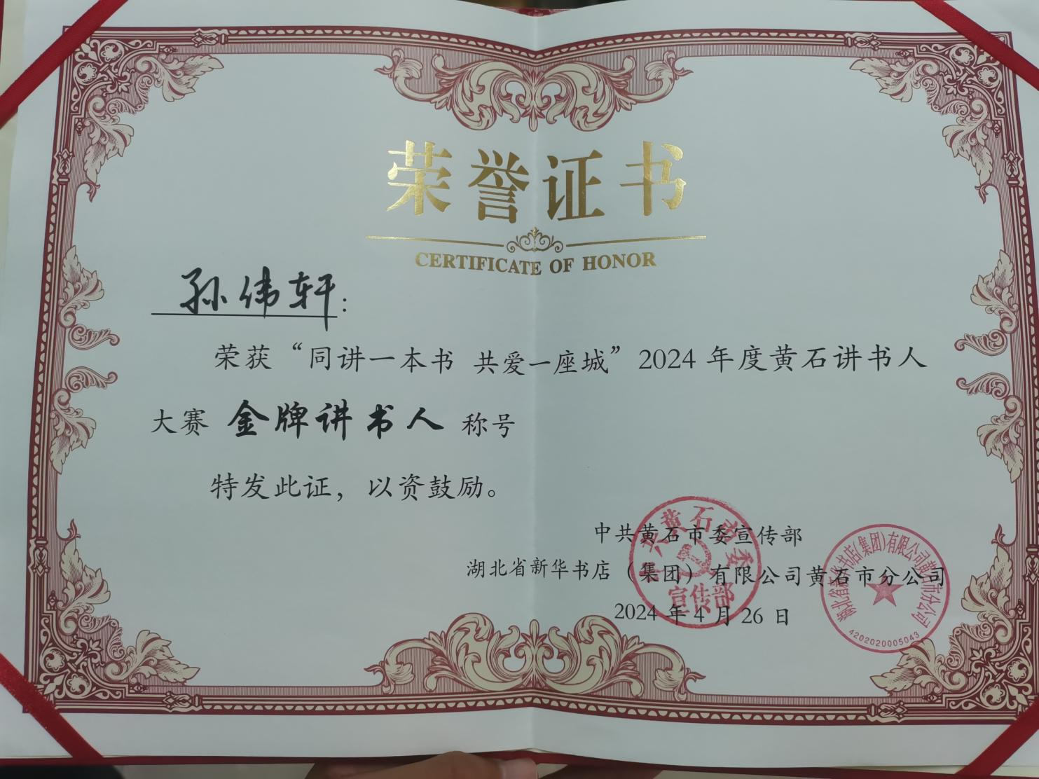 来自黄石市教育局(中小学)、湖北师范大学、湖北理工学院、星空体育·(中国)官方网站XINGKONG SPORT、湖北工程职业学院等23名选手参加了激励角逐,我部小学教育2105班的孙伟轩同学用自己独特的视角和方式,讲述了黄石的历史变迁、风土人情,黄石人的顽强向上钢铁精神,表达了对黄石以及长篇小说《钢的城》的炙热情感。他的精彩表现获得了9.72分的高分,位居第一,荣获“金牌讲书人”称号。