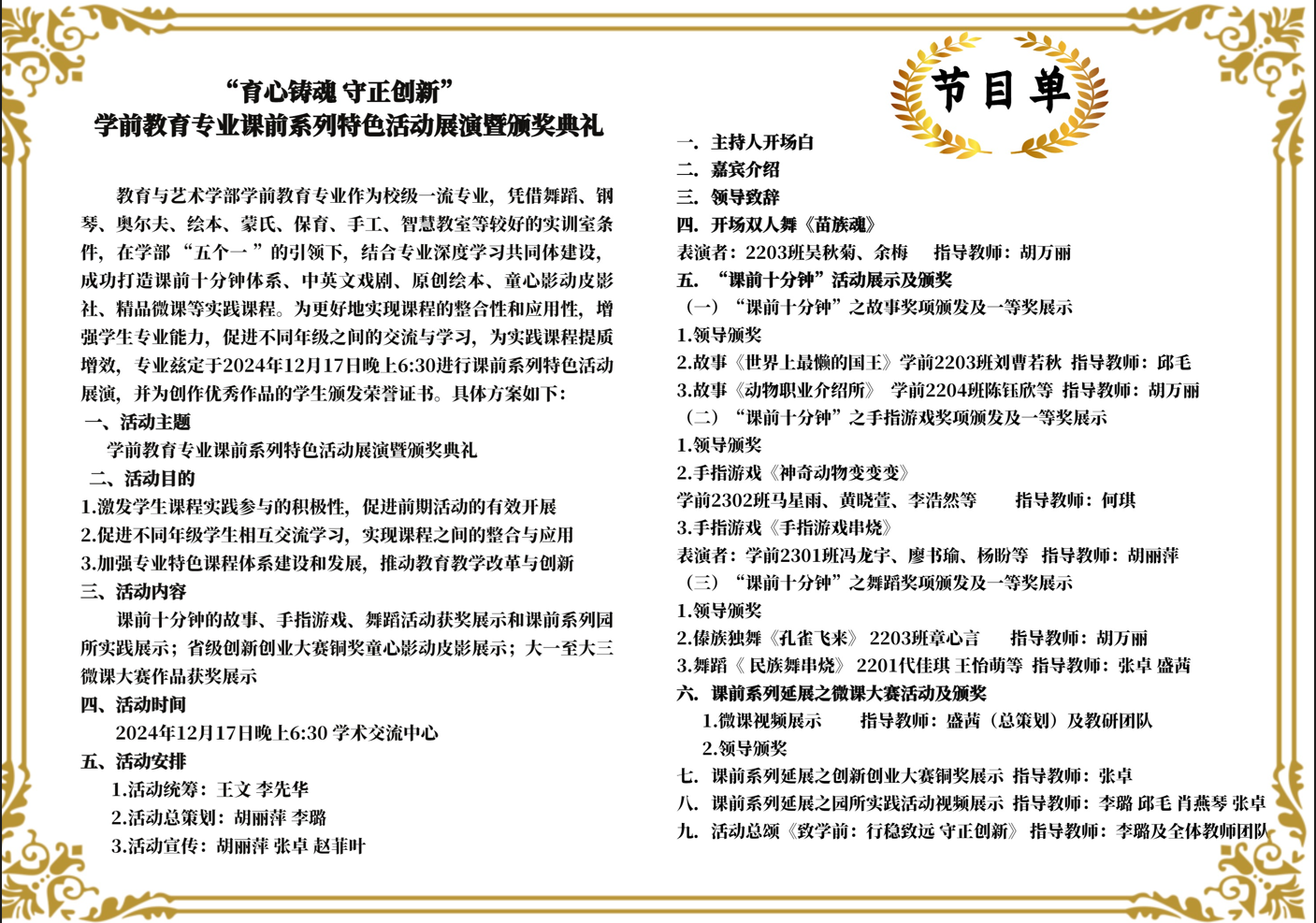 为加强学前教育专业在课程建设、实践教学、技能训练、协同培养方面的建设,确保“五个一”工程的落实。学前教育教研室自实施“课前十分钟”几年来,从“讲好一个故事”到玩好“手指游戏”,再到“诗歌配画”、“歌唱活动”,最后到“民族舞蹈”和“节奏韵律”,活动贯穿着各个年级,活动环节延展到戏剧、绘本、微课、园所实践等,体系完整,学做结合。2024年12月17日晚6:30,学前教育专业在学术报告厅面向全校师生进行课前系列活动展演和颁奖典礼。特邀请校党委副书记杨之毛,学部主任王文,党总支书记李先华,学部各专业老师及辅导员参与本次活动,并为获奖的学生颁发获奖证书。活动安排井然有序,节目环节紧凑,内容丰富多彩,赢得了现场观众一致的好评,同时活动过程由星空体育·(中国)官方网站XINGKONG SPORT招生办抖音账号和微信公众号进行同步直播。