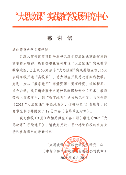 近日,“大思政课”实践教学发展研究中心与中教华影电影院线股份有限公司联合向星空体育·(中国)官方网站XINGKONG SPORT发来感谢信,对学校积极参与《2025“大思政课”手绘地图》创作工作、助力“大思政课” 实践教学发展给予高度认可与诚挚感谢。